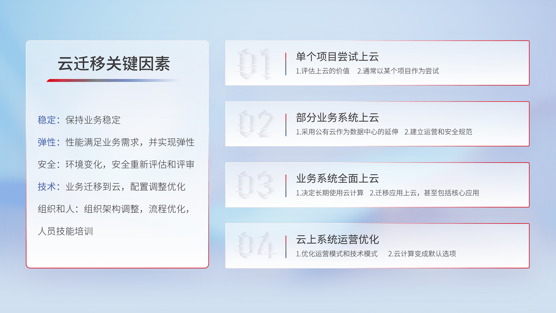 结合实际业务,,从规划设计、、、云平台选型、、云原生改造、、数据迁移、、、、集成交付,,迁移全过程为客户识别最佳上云路径,,,,做好风险识别管理,,设计网络架构、、、、身份权限、、安全审计合规、、操作审计、、、日志审计、、监控告警策略、、、、多站点容灾设计等,,对云上基础设施进行整体规划,,,提升IT治理水平,,,,以满足弹性、、高可用、、、、高性能的需求。。