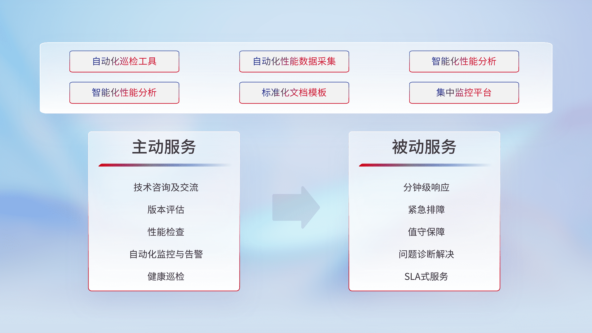 智能化工具和标准化文档,,,,保障服务质量,,提供主动服务(包含技术咨询、、、版本评估、、、、性能检查、、自动化监控与告警、、健康巡检)和被动服务包含(分钟级响应、、、、紧急排障、、、、值守保障、、问题诊断解决、、、SLA服务)。。。。